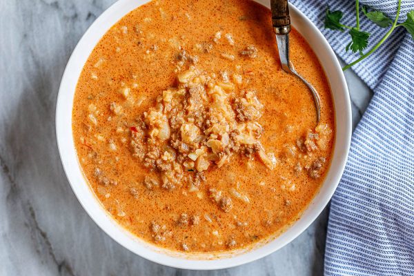 Sopa de queso con crema de coliflor sopa de coliflor con queso crema y res! Está repleto de ingredientes buenos para usted como carne molida, coliflor, tomate, cebolla y ajo, todo cocinado en queso crema y caldo de carne. Si tiene 30 minutos y esos pocos ingredientes, está listo para una cena satisfactoria y reconfortante. Sin gluten y apto para todos los gustos – ¡Disfrútalo!