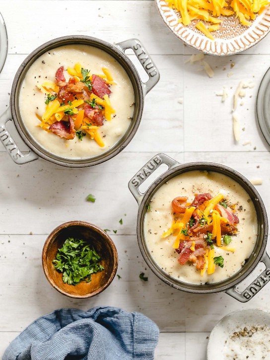 La sopa de papa al horno cargada es una comida cómoda, pero también tiene muchas calorías. Mi versión light cambia las papas por coliflor baja en calorías/baja en carbohidratos manteniendo todo el encanto reconfortante.
