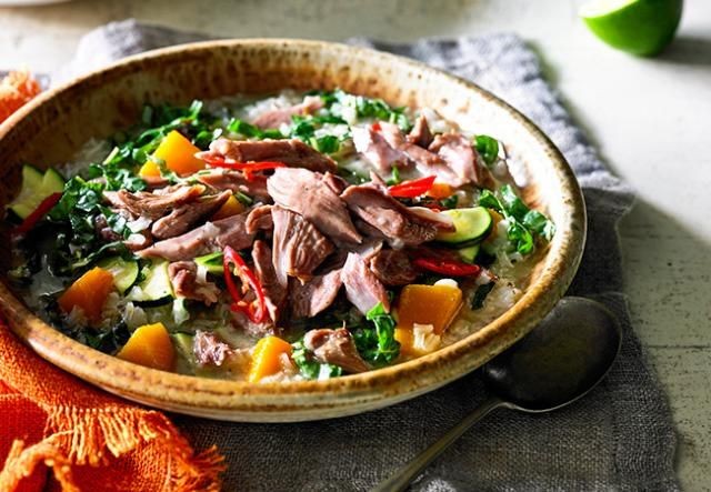 Destruye el cordero y vuelve a la sopa. Revuelva entre las remolachas plateadas. Sirva la sopa en tazones y agregue pimienta y mucha albahaca tailandesa. Servir con rodajas de lima.