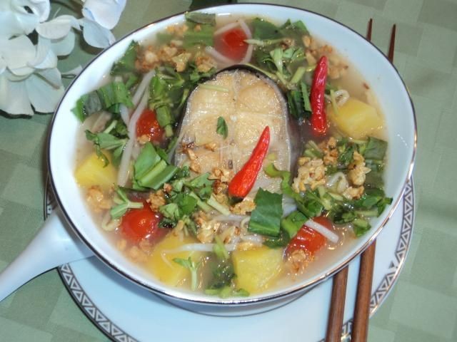 Agregue el pescado frito a la sopa. Sirva la sopa en una olla caliente o en un tazón grande.