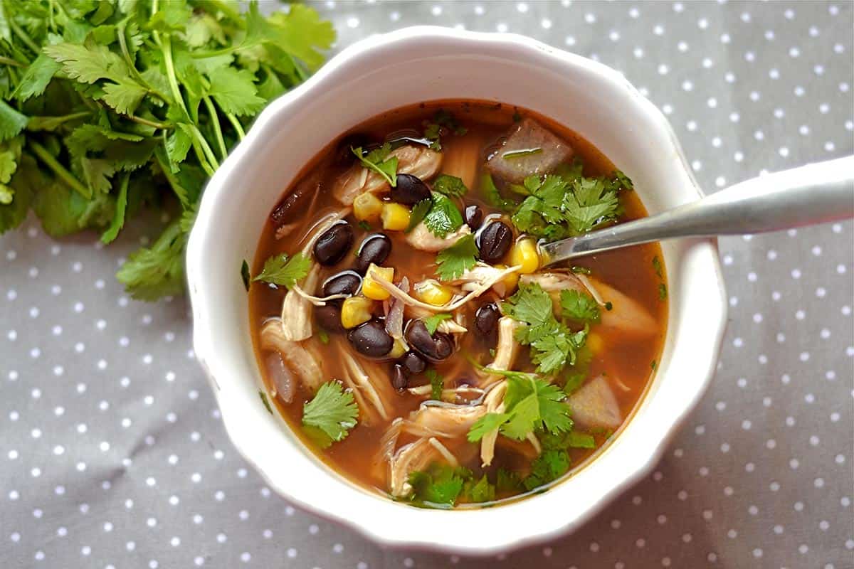 Si estás buscando una cena realmente rápida y fácil, ¡aquí está! La semana pasada, todos en nuestro hogar parecían tener el virus del resfriado por ahí. Estornudos, dolor de garganta, tos; Estoy seguro de que todo el mundo sabe sobre el ejercicio. El marido parecía estar más malhumorado una noche. Además, corría como loca con días enteros. Una sencilla receta de sopa era obvia. Lo que me encanta es que tiene un alto contenido de proteínas con frijoles negros y pollo. Se puede personalizar fácilmente para una sopa de verduras salteando el pollo y agregando otro tipo de frijoles como frijoles o batatas. Esta es una receta Paleo adaptable, omitiendo frijoles y maíz (quizás reemplazándolos con batatas). Mi esposo realmente odia los frijoles, ya que estoy seguro de que has leído esto. Necesito agregarlos después de servir tu plato. ¡Alto mantenimiento te digo! Comentó que era el alimento perfecto debido a sus síntomas, así que creo que valió la pena el arduo trabajo de clasificar los frijoles negros.