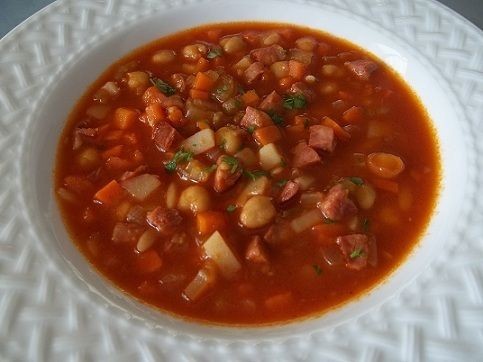 A fuego medio-bajo, sofreÃr la cebolla, la zanahoria, el apio, la patata y el chorizo ​​en el aceite durante 10-15 minutos hasta que el chorizo ​​empiece a tomar el color de las demás verduras y empiece a ablandarse.