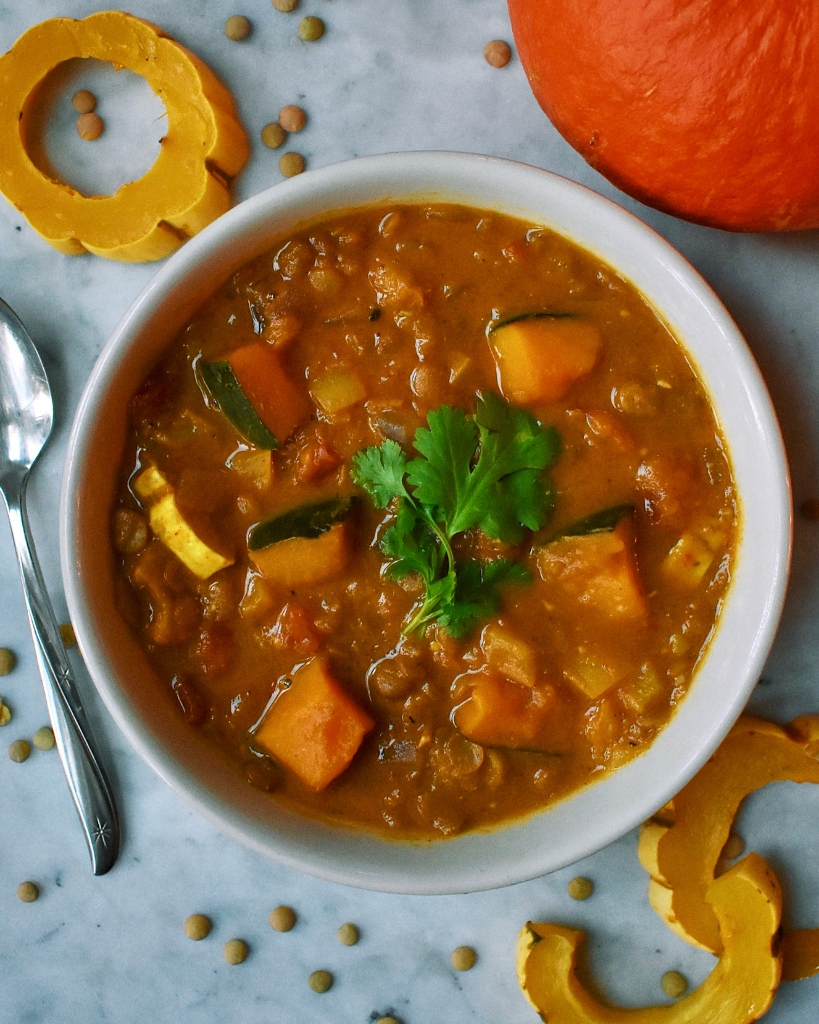 Esta sopa vegana de curry de lentejas y calabaza sin gluten es rica y sabrosa. Un plato único perfecto para los días fríos de otoño e invierno.