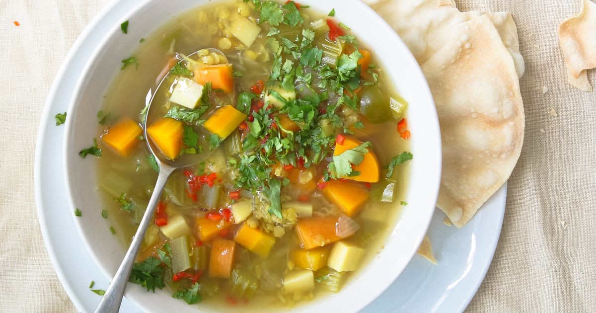 Agregue las lentejas y el caldo, cocine por unos 30 minutos, agregando más caldo o agua si es demasiado espeso.
