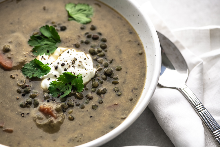 La clave para la textura de una sopa de lentejas perfecta es mezclar solo la mitad, dejando el resto para agregar textura.