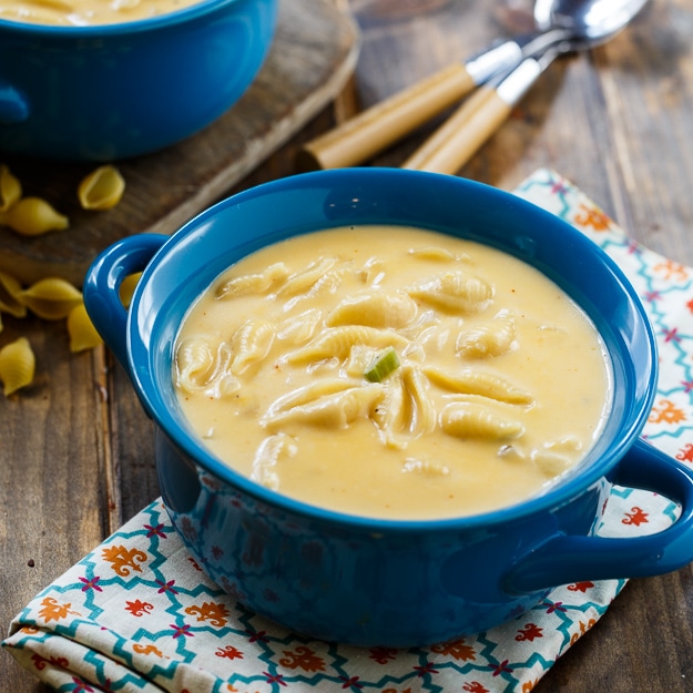 Con queso cheddar y velveeta, esta sopa tiene mucho sabor a queso. Usé conchas pequeñas para la masa, pero puedes usar cualquier forma. Asegúrese de no cocinar demasiado los fideos. Si quieres algo realmente fuerte, solo un toque es suficiente. Nadando en ese líquido tibio y pegajoso, va a ser muy suave.