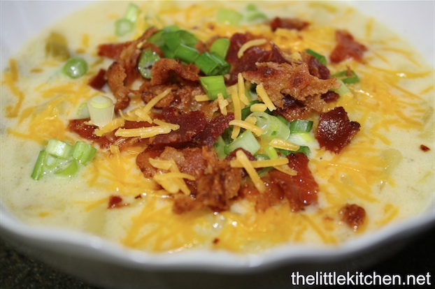 - Sazone con sal y pimienta antes de servir. Sirva en tazones y adorne cada tazón con queso, tocino (opcional) y cebollín.
