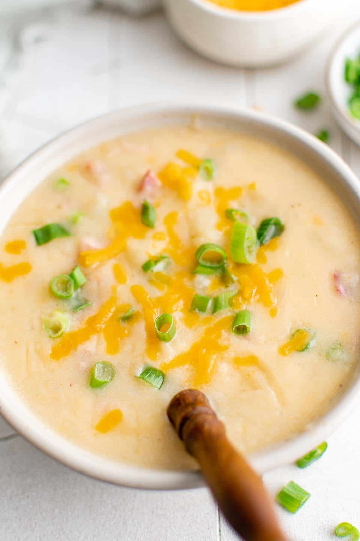 ¡La sopa de papa instantánea es cremosa, cursi y deliciosa! ¡La sopa de papa al horno más fácil preparada rápidamente en su olla instantánea llena de papas esponjosas, coberturas perfectas y mucho queso cheddar!