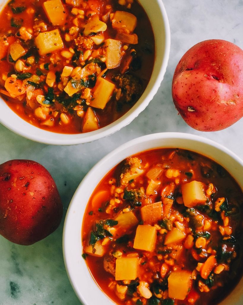 Esta sopa de patata tempeh es una base de tomate, con migas de tempeh y gajos de patata. También está lleno de otras verduras: puedes usar lo que tengas a mano o lo que prefieras.