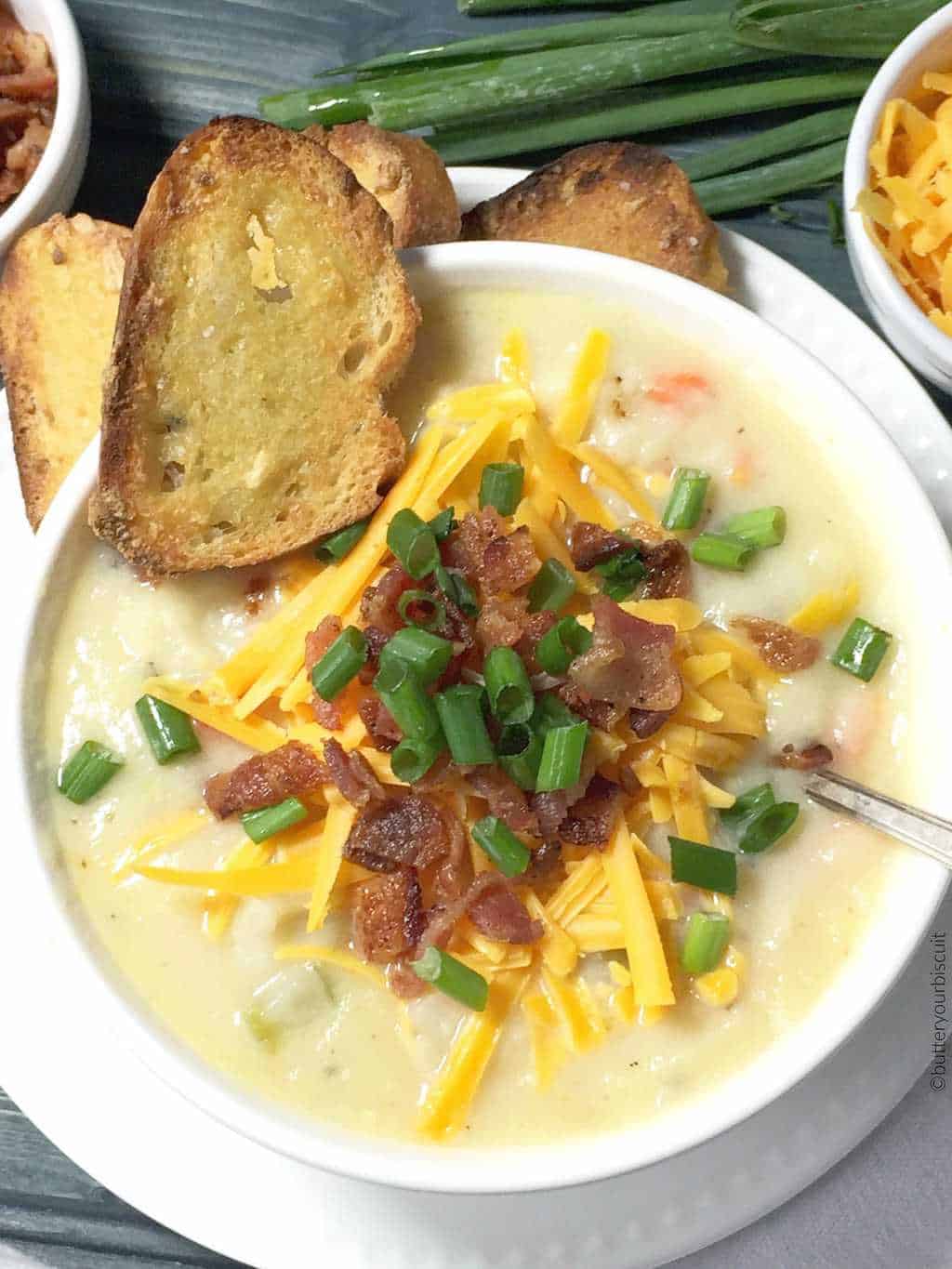 ¡Esta sopa de papa cargada está rellena con trozos tiernos de papa, algunas verduras, tocino y queso! Cuando llega el frío, me encanta hacer sopas. Esta es una receta simple y se considera la mejor comida reconfortante.