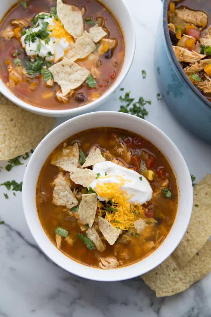 Me ocupo de las sopas en esta época del año, ¡especialmente cuando son rápidas y fáciles! Puedes preparar esta sopa de tortilla de pollo en aproximadamente 30 minutos o también he incluido instrucciones para prepararla en la olla de cocción lenta o en la olla instantánea para que puedas prepararla como quieras. ¡Es saludable, sabroso y simplemente BUENO!