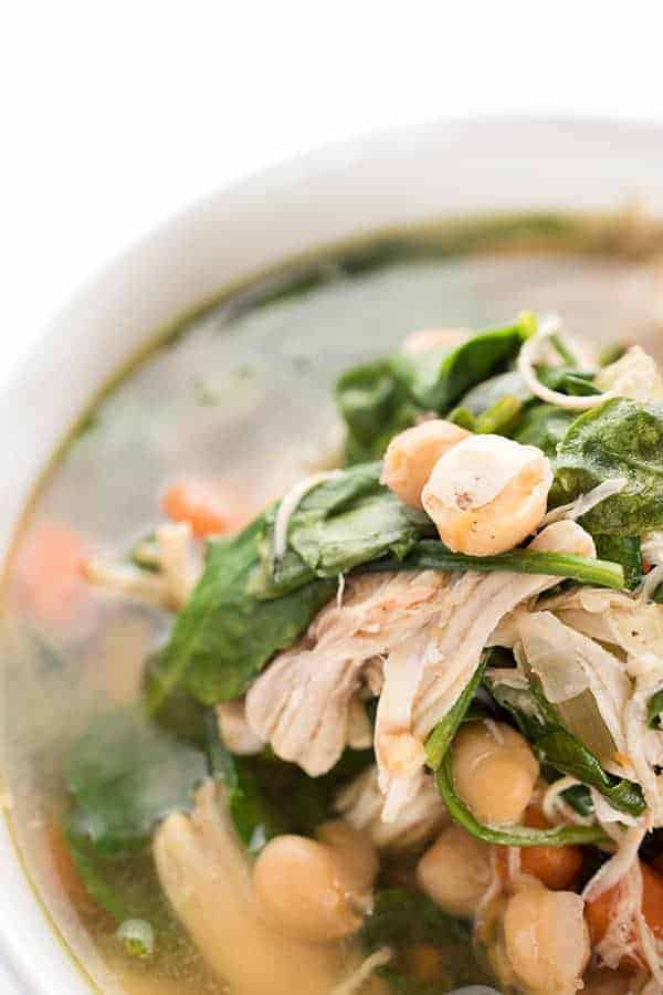 La sopa de pollo libanesa está lista en poco tiempo gracias a Instant Pot. Rellena de garbanzos, jugo de limón, canela y espinacas, esta receta de sopa de pollo naturalmente no contiene gluten.