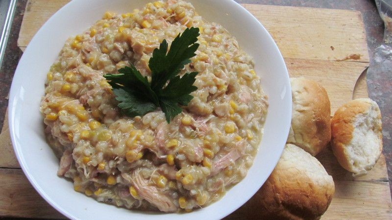 Cocine hasta que quede suave y fragante, luego transfiéralo a una cacerola y agregue el pollo, los granos de elote, la crema de elote, el caldo de pollo, la cebada, la sal y la pimienta.