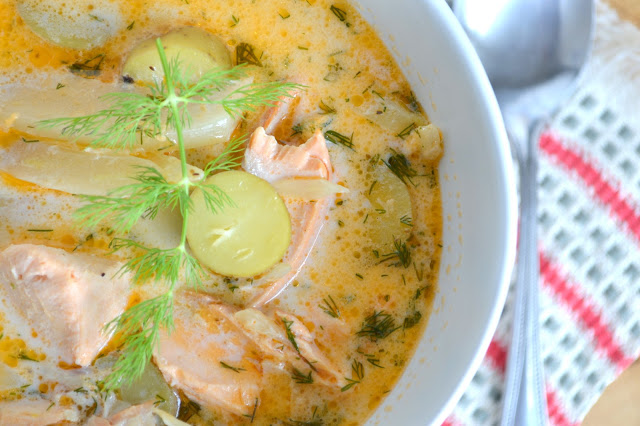 Cortar el salmón en trozos grandes y añadir a la sartén. Mezclar todo suavemente, agregar el eneldo, tapar y retirar del fuego.