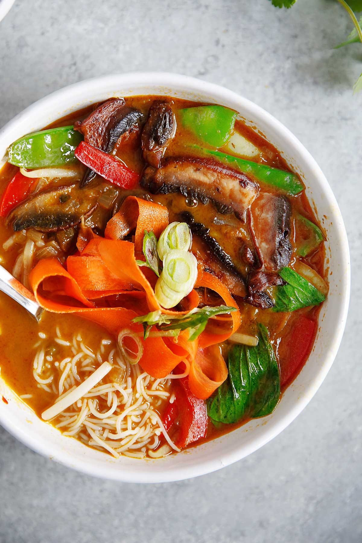 Este ramen de coco y curry verde es rico, sabroso y cremoso sin leche. ¡Es un gran plato sin carne y sin gluten para cualquier noche de la semana que puedes encontrar en 30 minutos!