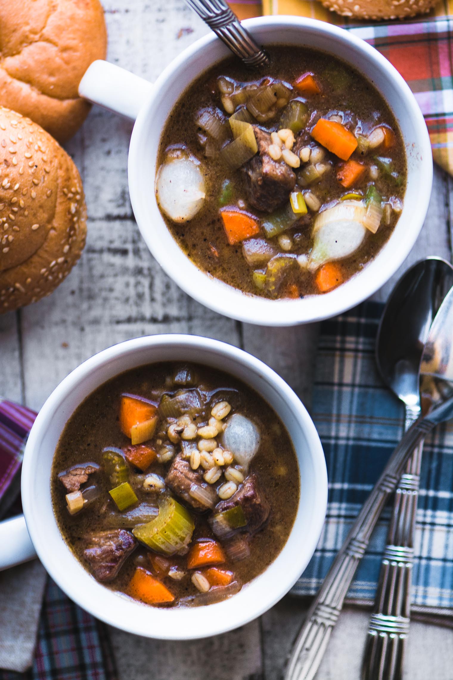 Sopa de cebada y res ~ agregue otro leño al fuego y acomódese con una taza humeante de esta clásica sopa reconfortante. Puedes cocinarlo a fuego lento o dejar que la olla de cocción lenta haga el trabajo.