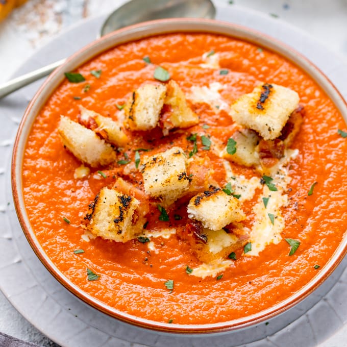 Sopa de Tomate Vegetariana Oculta con Tocino y Crutones de Gruyère