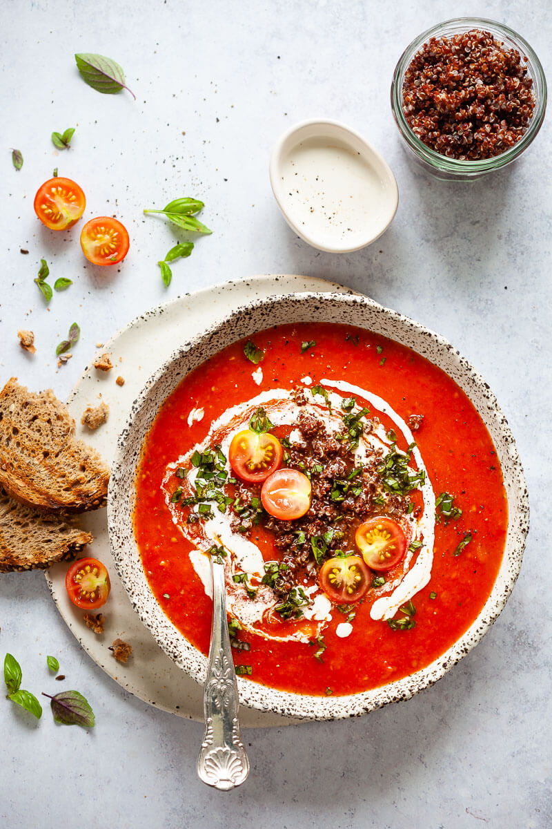Sopa casera de tomates y pimientos asados con pimientos, tomates y quinoa. Vegano y sin gluten.