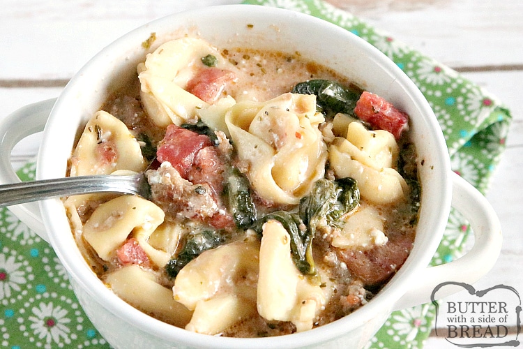Crockpot Salsiccia Tortellini Sopa hecha con salchicha italiana, tortellini, espinacas frescas, tomates enlatados en un sabroso caldo cremoso. ¡Esta receta de sopa de olla solo toma unos minutos para prepararse, por lo que la olla de cocción lenta hace el resto del trabajo! Plato: Plato Principal, Sopa Cocina: Americana Palabra clave: Sopa De Tortellini Con Salchicha Crockpot Tiempo De Preparación: 10 Minutos Tiempo De Cocción: 4 Horas Porciones: 8