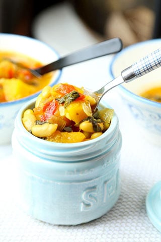 La calabaza bellota de color amarillo anaranjado vibrante realmente absorbe la dulzura limpia y natural que el tomate fresco agrega a esta sopa. Los frijoles Cannellini realmente aportan un elemento sustancial a la mesa. ¡No es frecuente que una sopa se llene lo suficiente como para estar sola sin una guarnición más sustancial o dos!