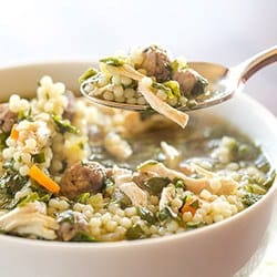 - Agregue suavemente las albóndigas a la sopa y cocine por 7 minutos. Agregue la pasta y cocine por otros 6 minutos. Agregue las espinacas y cocine por otros 3 minutos. Agregar el pollo rallado. Tape nuevamente y cocine por otros 30 minutos más o menos. Puede comerlo tan pronto como se recaliente el pollo, pero dejar que se cocine un poco más permite que se mezclen todos los nuevos sabores.