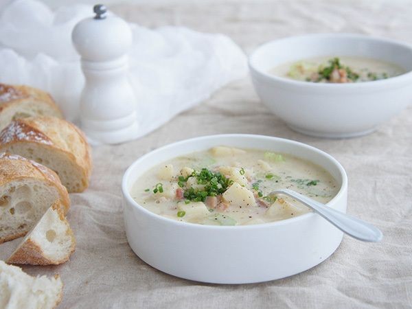 Mezcle la harina en media taza de leche, luego, una vez mezclada, agregue la leche restante y mezcle. Vierta lentamente la mezcla en la sopa. Aumente el fuego y revuelva constantemente hasta que la sopa hierva y se espese.