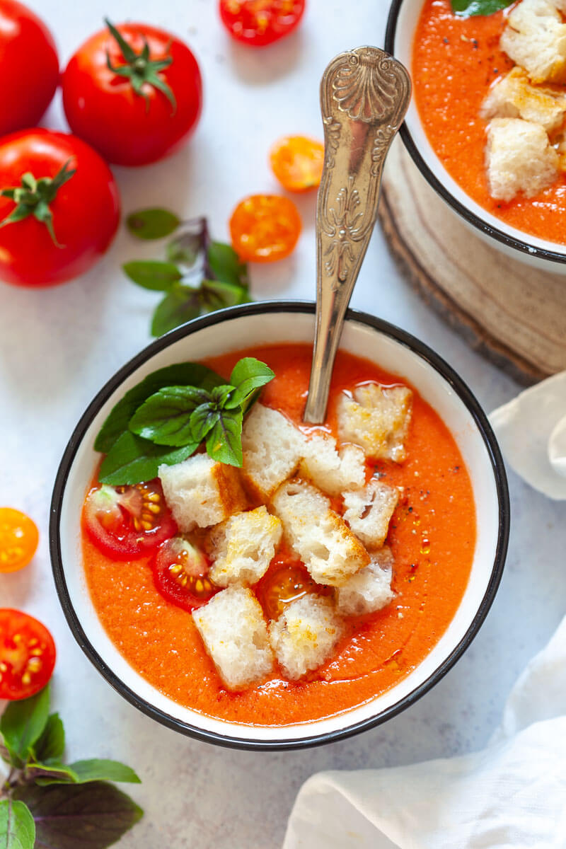 Esta sopa de tomate y gazpacho se sirve mejor fría en un caluroso día de verano mientras los tomates están en temporada. ¡Disfrutar!