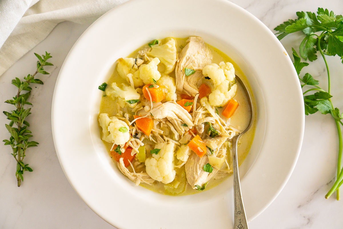 Esta sopa de pollo y coliflor está CARGADA de verduras: tiene cebollas, zanahorias, apio y media cabeza de coliflor. Pero ciertamente no es gusto saludable, con su sabroso caldo cremoso y muchas hierbas frescas. La sopa en sí es bastante baja en calorías y baja en carbohidratos.