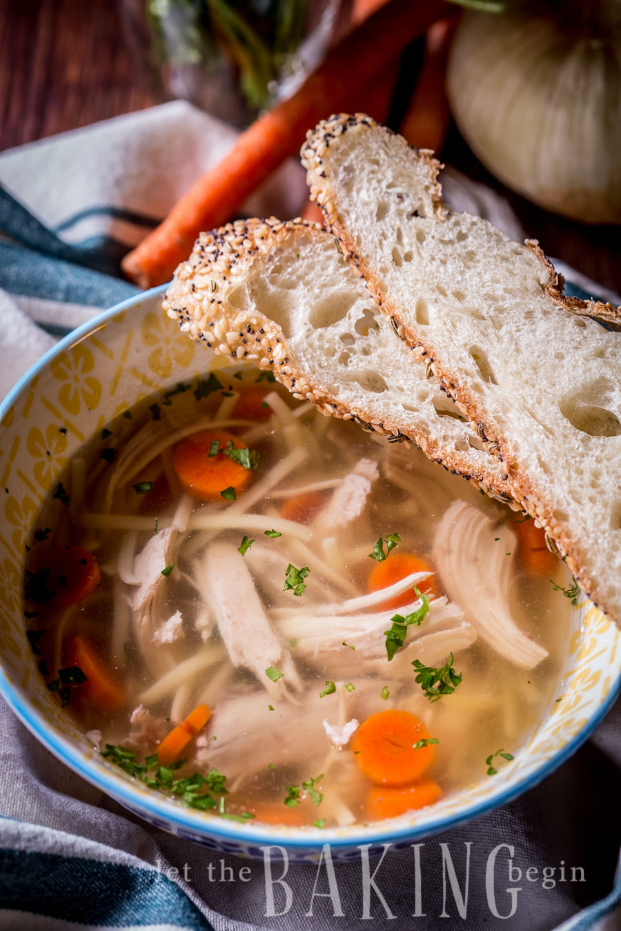 Esta simple sopa de fideos con pollo también es una excelente manera de usar las sobras o las verduras en el último tramo. Por ejemplo, si todavía tienes pasta casera, definitivamente este es un buen lugar para usarla. Y si no lo hace, los fideos comprados en la tienda funcionarán bien.