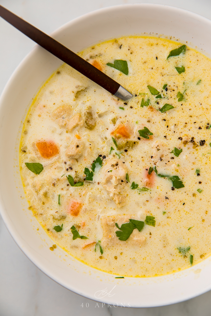 ¡Esta sopa cremosa de pollo y arroz está hecha en una olla instantánea y es Whole30, paleo y baja en carbohidratos! ¡Esta sopa es tan rica y sabrosa como súper abundante! También es una excelente sopa Whole30 para preparar alimentos.