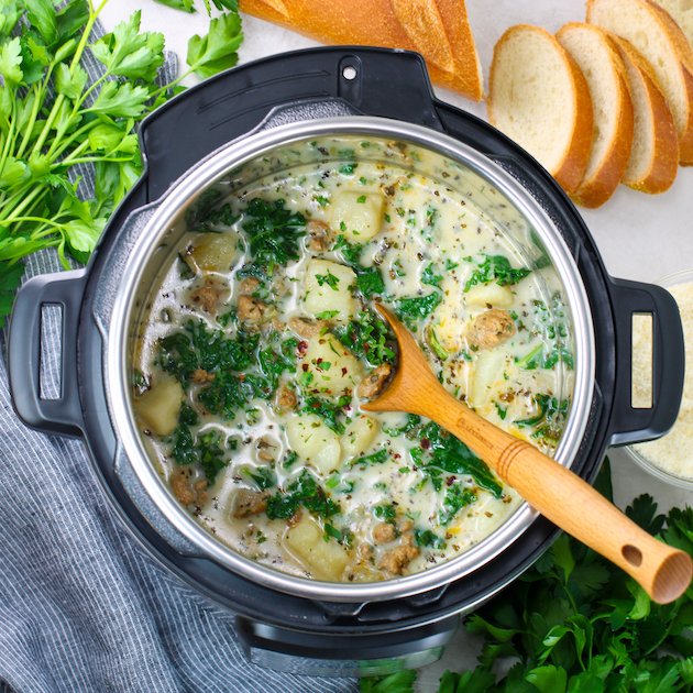 Esta receta casera de sopa toscana instantánea en una olla es muy abundante y está llena de ingredientes sabrosos como salchicha de pavo italiana, repollo, queso parmesano y papas. Además, es libre de gluten.