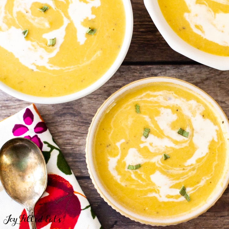 Me encanta el aspecto de esta sopa con un poco de crema extra encima y un poco de salvia picada. También puede decorar con una cucharada de crema agria y nueces tostadas o semillas de calabaza.
