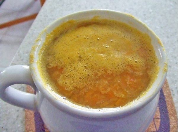 Utilice la cuchilla de corte en el procesador de vegetales. También puedes agregar tocino picado. Recientemente usé caldo de res real y agregué más zanahorias para hacer la sopa más espesa. Cuando cogimos la gripe no hace mucho, descubrimos que ayudaba con el resfriado. Aunque era diabético, descubrí que ayudó a mis niveles de azúcar en la sangre. Pica finamente o trata las cebollas doradas, córtalas en cubos finos o trabaja las zanahorias y córtalas en cubos finos o procesa las kumaras naranjas (boniato). Use cilantro fresco o seco y caldo de pollo o res.