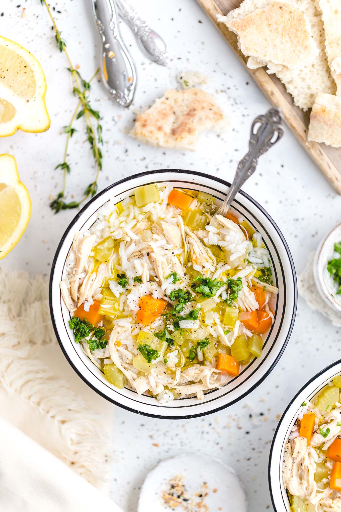 Esta sopa de pollo y arroz de cocción lenta es saludable, sabrosa y sin complicaciones, hecha con pechuga de pollo deshuesada y sin piel, cebolla, zanahoria, apio, ajo, tomillo fresco, hojas de laurel, caldo de pollo y arroz blanco instantáneo (para mayor comodidad) .