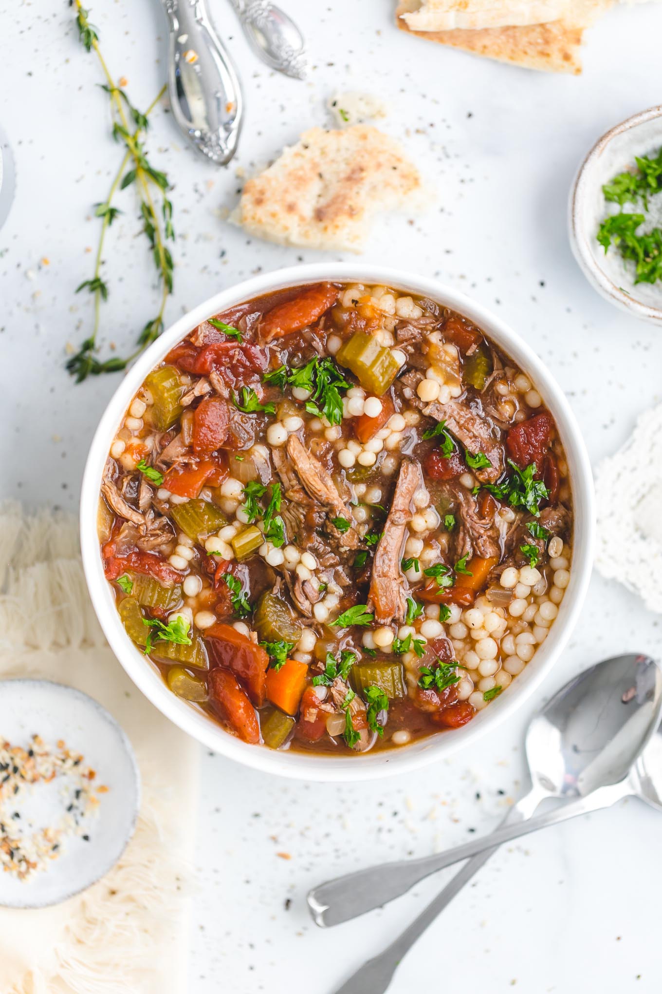 Febrero es el mes en el que pones tu olla de cocción lenta en el mostrador y dejas que su magia funcione, convirtiendo un trozo de carne duro en trozos tiernos, tal como lo haces en esta deliciosa sopa de bistec de cocción lenta con cuscús hecha con carne de res, zanahorias, apio, cebolla, ajo, tomate, hierbas y cuscús perla.