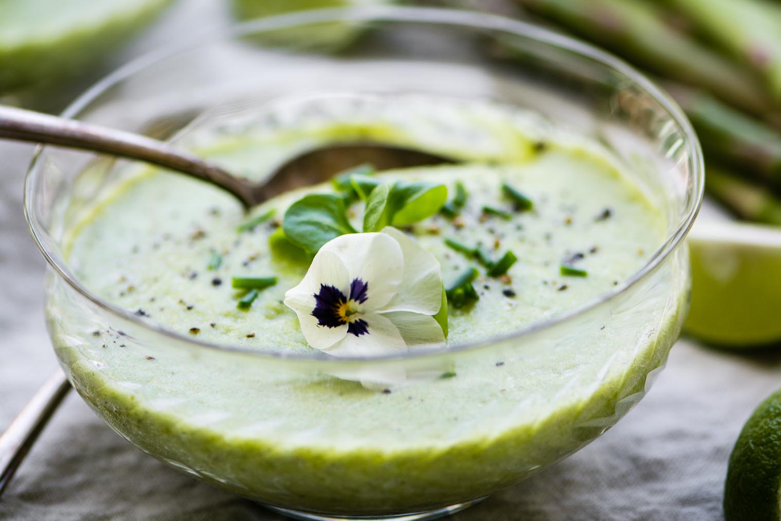 Te sigo, no soy muy fan de la sopa de espárragos. El color y el sabor pueden ser un poco desagradables y nunca ha sido uno de mis favoritos. Así que pensé en probar algo un poco diferente con esta receta. Mi sopa está hecha con espárragos crudos (también puedes usar espárragos ligeramente cocidos al vapor), lo que la mantiene fresca y brillante. La licuadora purifica todo en un instante, y mantengo los sabores simples para que los delicados espárragos de primavera brillen. Para un pequeño lujo, mezclaré un poco de crema, crema fresca o crema espesa (también puedes usar yogur). Sirva en tazones pequeños o vasos de chupito para comenzar la comida.