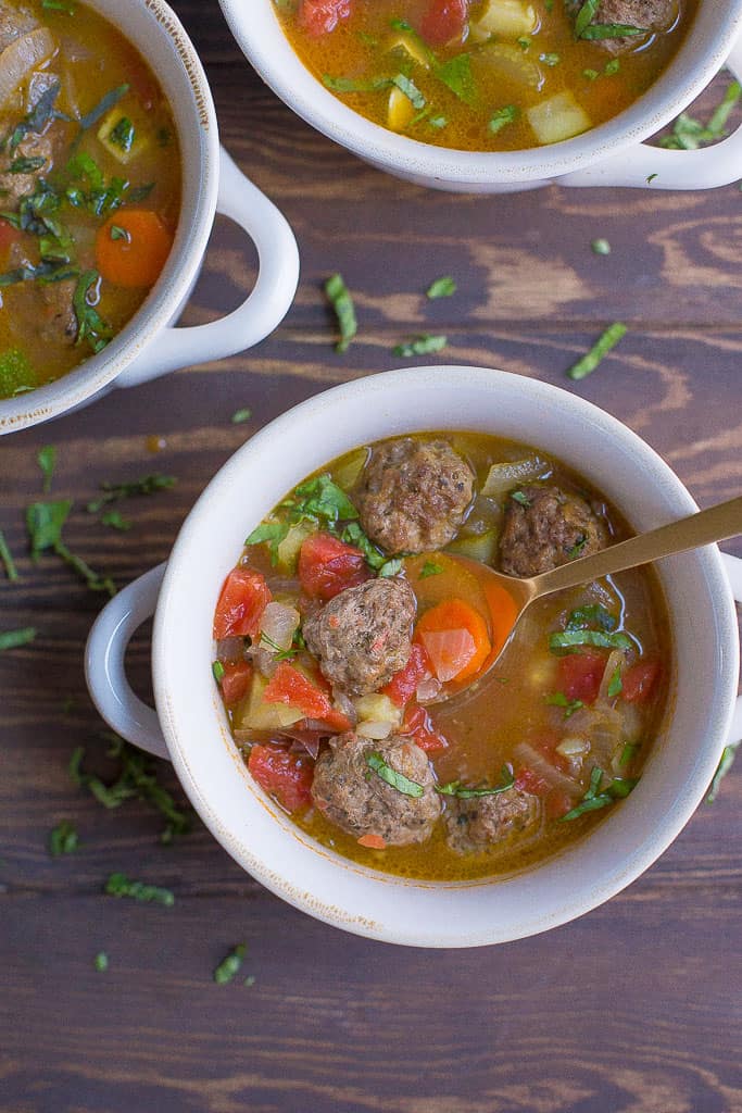 ¡La sopa de albóndigas minestrone es una comida de invierno reconfortante llena de vegetales frescos! Las albóndigas reemplazan los frijoles o los fideos que se usan en una sopa minestrone tradicional con una versión sin granos, Paleo y Whole30. Cubierto con hierbas frescas para más sabor.