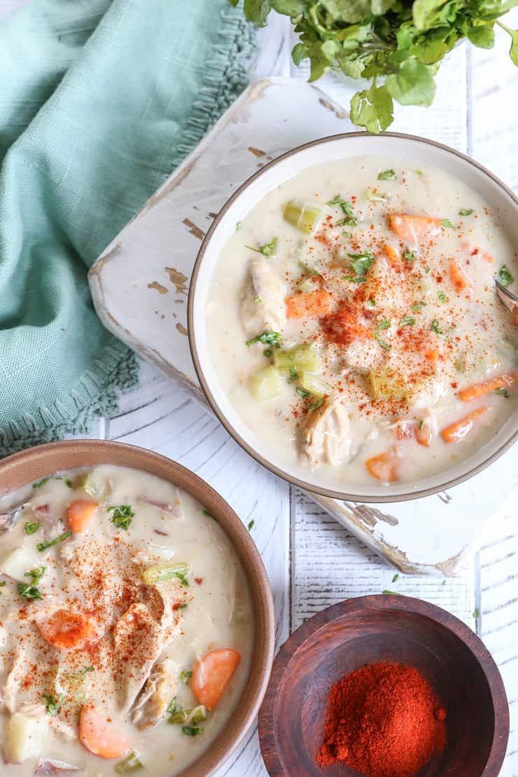 Sopa cremosa de pavo sin lácteos hecha con sobras de pavo para el Día de Acción de Gracias. ¡Psst! ¡Incluso puedes convertirlo en sopa de pollo paleo! ?