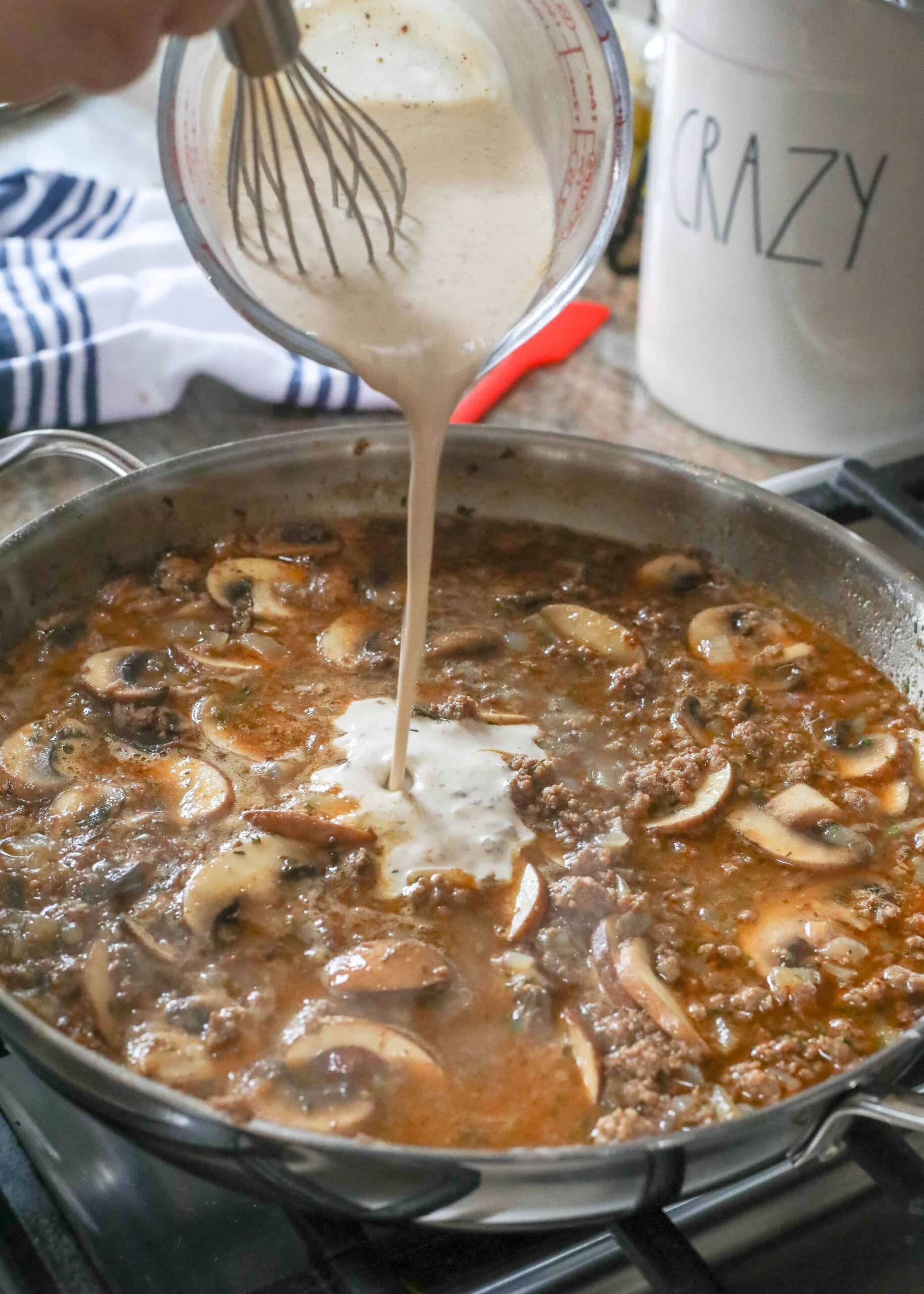 Cuando vi la carne molida, supe que estaba en el negocio. Había oído hablar de personas que hacían su strogonoff de carne antes, pero nunca lo había probado. Como la carne molida se cocina rápidamente, me salteé la olla de cocción lenta para esta receta y puse todo en la estufa.