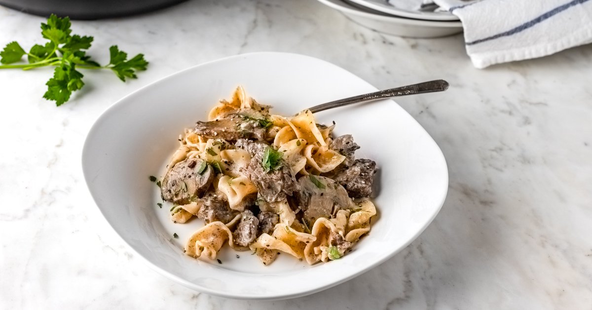 Este strogonoff instantáneo de carne de res con trozos de carne tierna y fideos de huevo envueltos en una salsa cremosa con sabor a mostaza, champiñones, cebollas y eneldo está repleto de sabor.