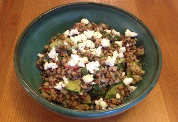 Los granos de trigo sarraceno, también conocidos como kasha, son semillas tostadas similares a granos de la planta de trigo sarraceno. A menudo se cocinan enteros y, a pesar del nombre, no están estrechamente relacionados con la familia del trigo y, por lo tanto, no contienen gluten. Siempre me ha encantado una ensalada tabouli brillante y refrescante y he descubierto que agregar sémola de trigo sarraceno hace que la ensalada sea más completa y sustanciosa. Tradicionalmente, el tabouli tiene un poco de tomate y siéntete libre de agregarlo. Finalmente, cuando sirvo un tazón de tabulí de trigo sarraceno, disfruto un poco más el queso feta.