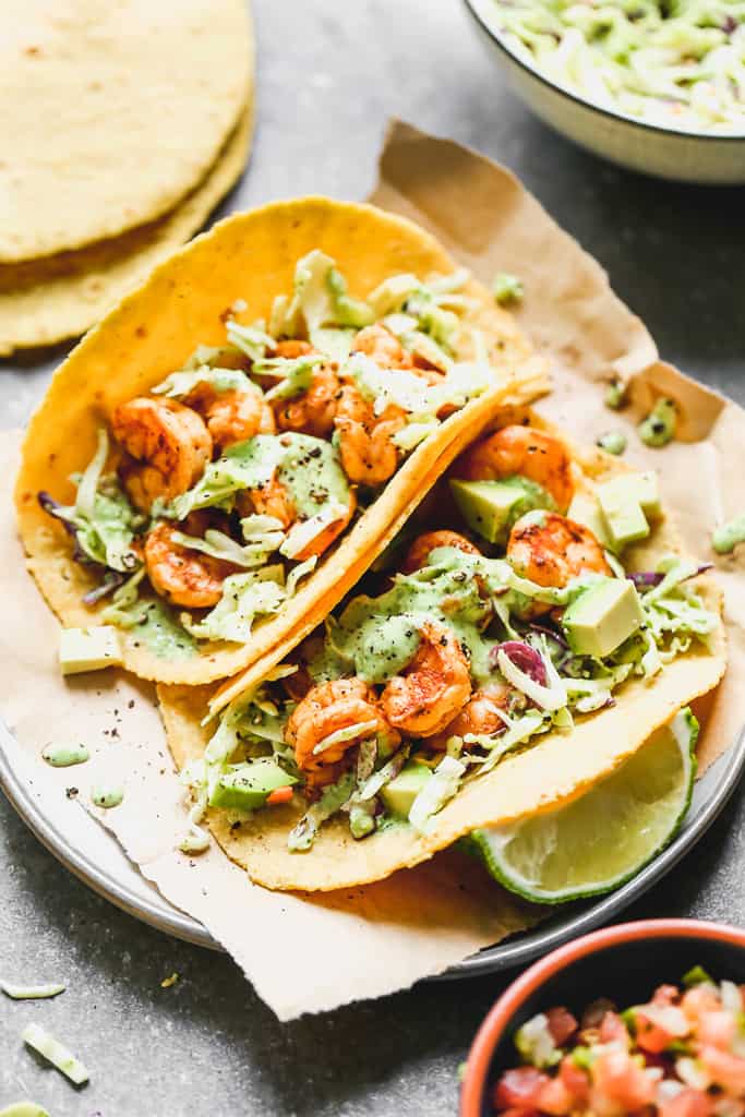 saludable y fácil Tacos de camarones hecho con camarones marinados y salteados, una simple ensalada de col y cubierto con un delicioso taco cremoso de camarones y salsa de cilantro. ¡Listo en 20 minutos!