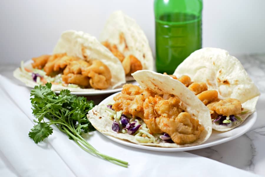 Estos tacos de camarones empanizados con cerveza cuentan con camarones dorados fritos crujientes con la capa perfecta de masa de cerveza sobre una ensalada de col picante y cremosa rellena en una tortilla de taco asada al fuego.