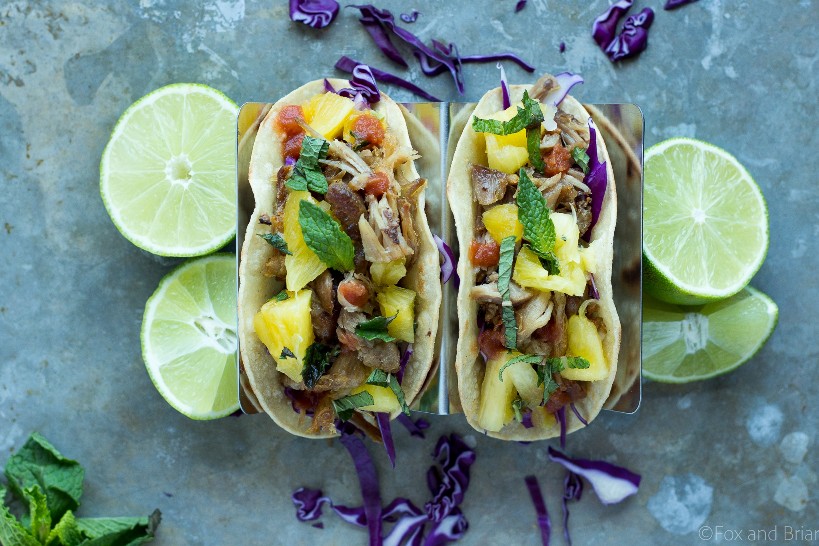 Tacos de cerdo cocidos a fuego lento con salsa de piña y menta