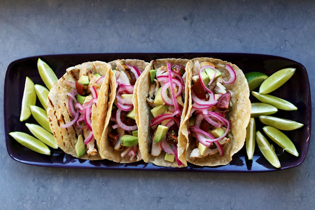 Deje que el pollo se enfríe un poco mientras prepara los ingredientes para tacos, luego córtelo en tiras finas. Arme los palos o deje que otros los hagan ellos mismos.