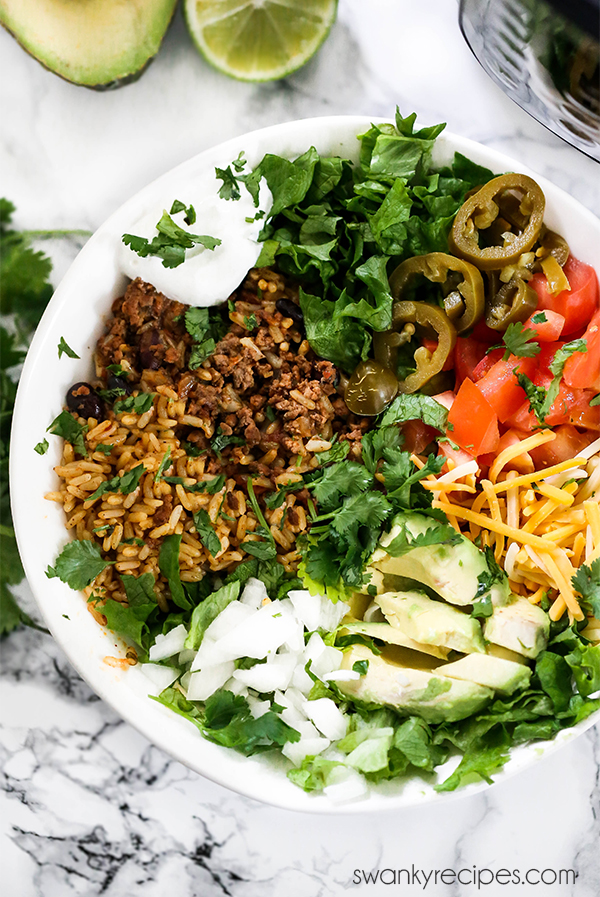 Los tazones de taco son mi receta mexicana en estos días. Conocí los tazones de burrito por primera vez en lugares como Izzo y Chipotle. Desde que me volví fanático de los tacos sin tortilla, aprendí a hacer los míos en casa. Esto no solo me ahorra mucho dinero, sino que gano lo suficiente para el plan de comidas de la semana.
