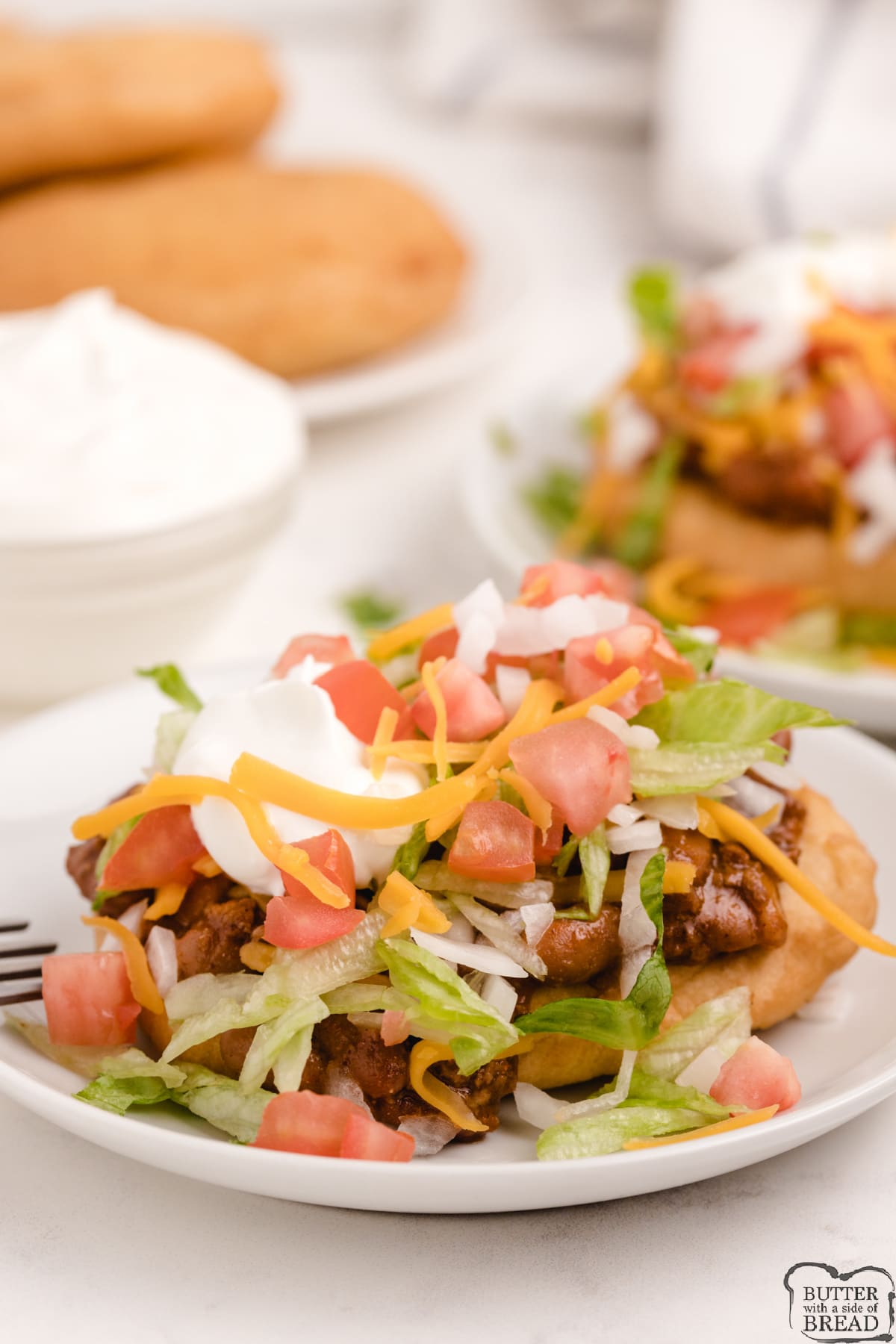 Tacos Navajos son perfectos para una cena fácil entre semana. Pan frito casero simple cubierto con pimienta, lechuga, tomate, queso, cebolla y crema agria.