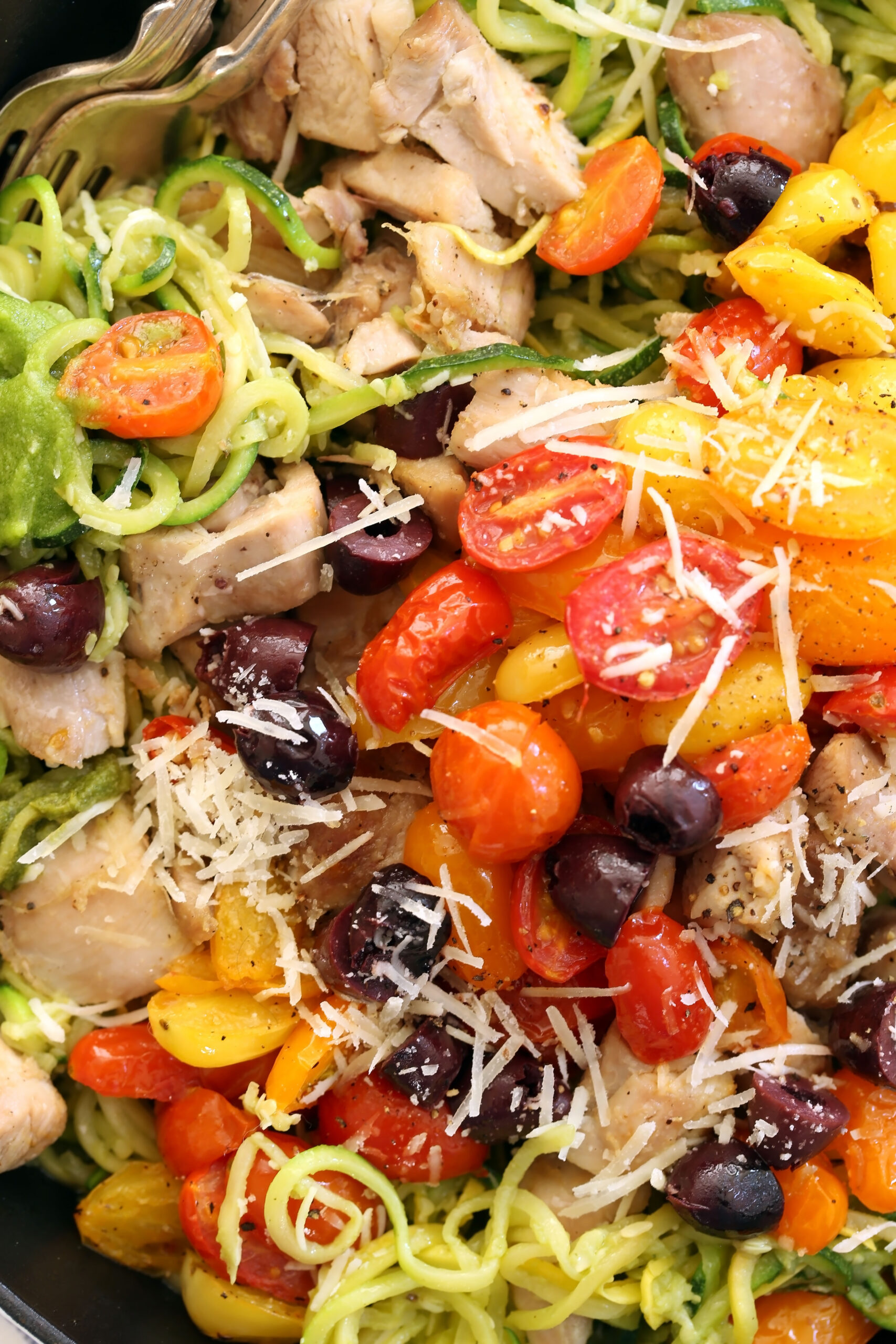 Para hacer esta receta necesitarás una inspiración, una mandolina o un pelador. He usado un Juliana Peeler antes, pero no obtienes las largas hebras de fideos como lo haces con un Inspiralizer. Recomiendo usar un Inspiralizer si tienes uno, y si no, no son demasiado caros en Amazon. Blanqueo rápidamente los fideos y los dejo a un lado mientras preparo todo lo demás. Este delicioso conjunto de pollo, fideos de calabacín, tomate asado (amor) y aceitunas kalamata se mezcla con un pesto de albahaca. ¡No puedo vivir sin pesto! Tengo un frasco de vidrio de pesto fresco almacenado en mi refrigerador o tendré cubos de pesto congelados en mi congelador. Los cubos de pesto congelados son excelentes para tener a mano para comidas fáciles como estas.