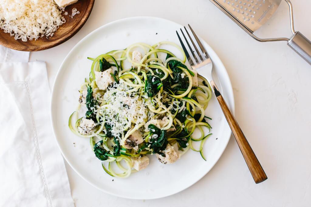 De fideos de calabacín con pollo, espinacas y parmesano son una receta ligera, baja en carbohidratos y saludable. Los fideos de calabacín son fáciles de hacer con mi espiralizador favorito y solo toma unos minutos cocinarlos.