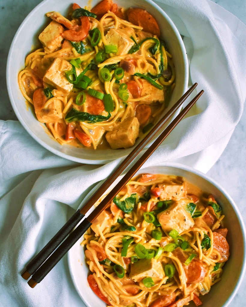 Esta podría ser una de mis recetas saladas favoritas en este sitio. Lo entenderás cuando lo intentes. La leche de coco alta en grasa hace que estos fideos sean tan cremosos y reconfortantes. También contienen un toque de sabor a pasta de curry rojo y especias.